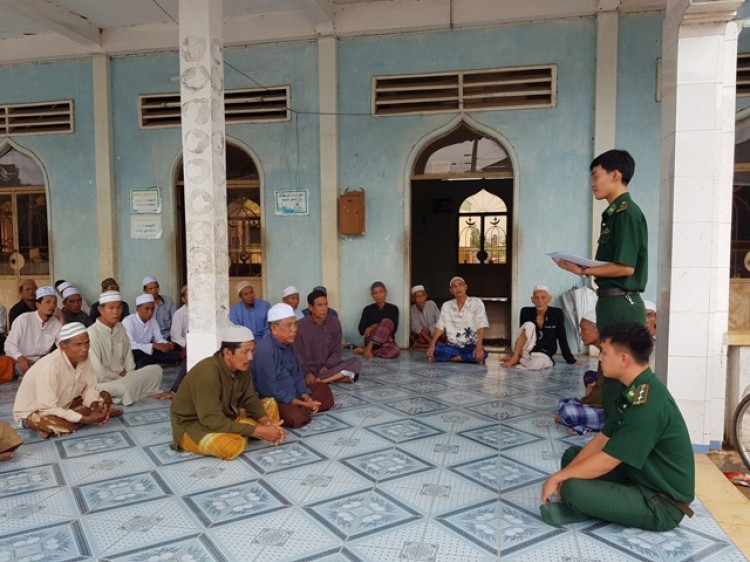 Cán bộ BĐBP tỉnh An Giang tuyên truyền pháp luật về biên giới quốc gia cho đồng bào dân tộc Chăm (xã Châu Phong, thị xã Tân Châu).