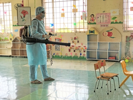 Phun thuốc, khử khuẩn để phòng dịch COVID-19, chuẩn bị cho các em trở lại trường học.